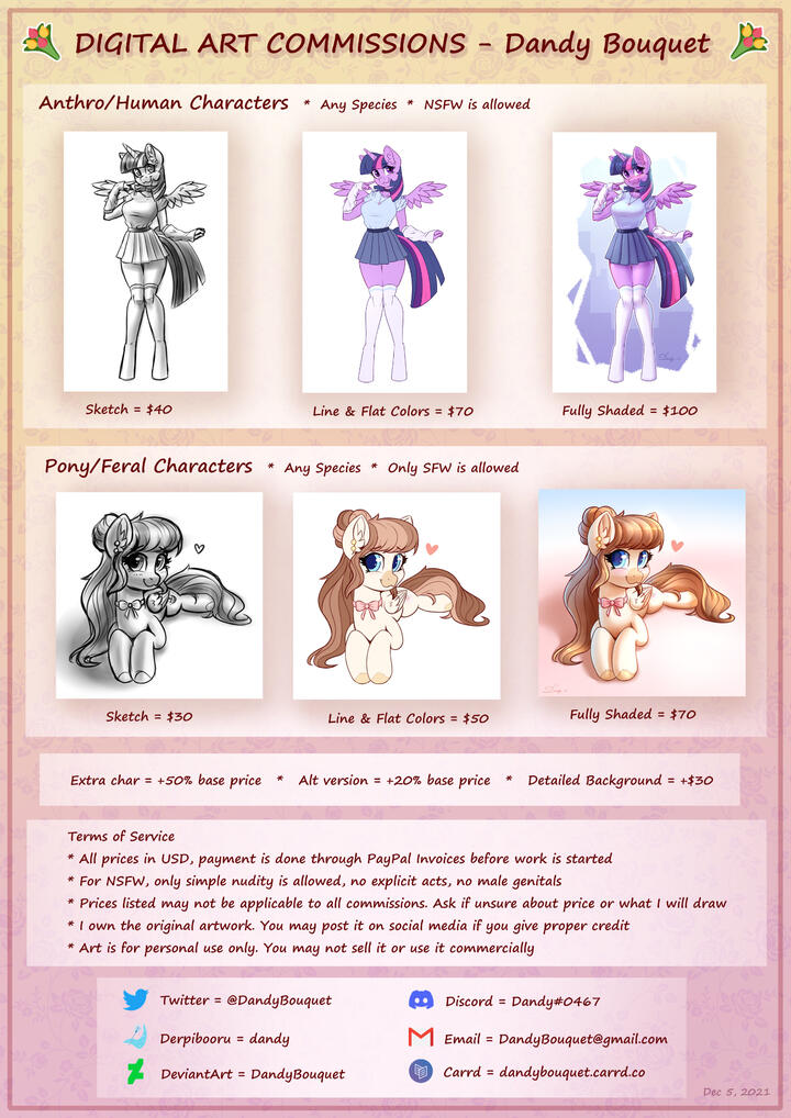 NOTICE: I very rarely open for commissions, please check my Twitter @DandyBouquet to see if I am currently open and to follow for future commission announcements.